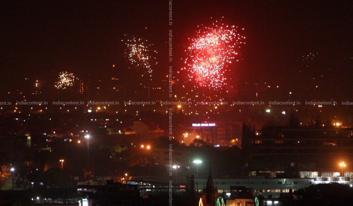 NEW DELHI INDIA - APRIL 02 Fireworks lit the sky as Indian cricket fans celebrate after their team won the Cricket World Cup final against Sri lanka in New Delhi India Saturday April 2 2011. Photo by Parveen Negi India Today Group