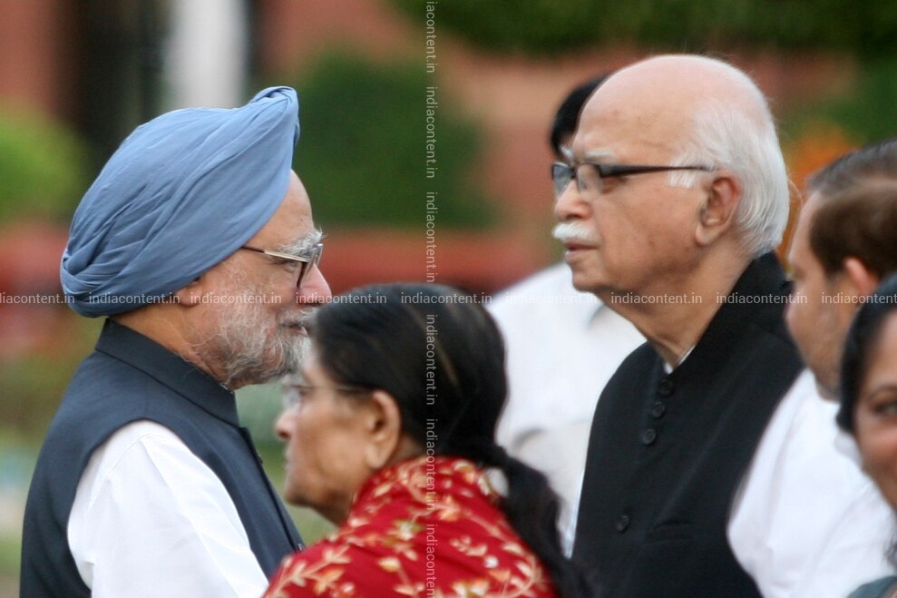 NEW DELHI INDIA - JULY 22 Manmohan Singh and BJP senior leader LK Advani at an at Home as part of farewell ceremonies for Patil at Rashtrapati Bhavan in New Delhi on Sunday. Photo by Shekhar Yadav India Today Group LK AdvaniManmohan Singh