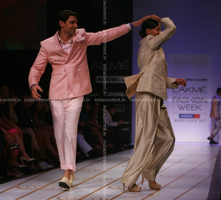 Fashion Designer Narendra Kumar and model with Narendra Kumar's creations at Lakme Fashion Week 2011 in Mumbai Maharashtra India