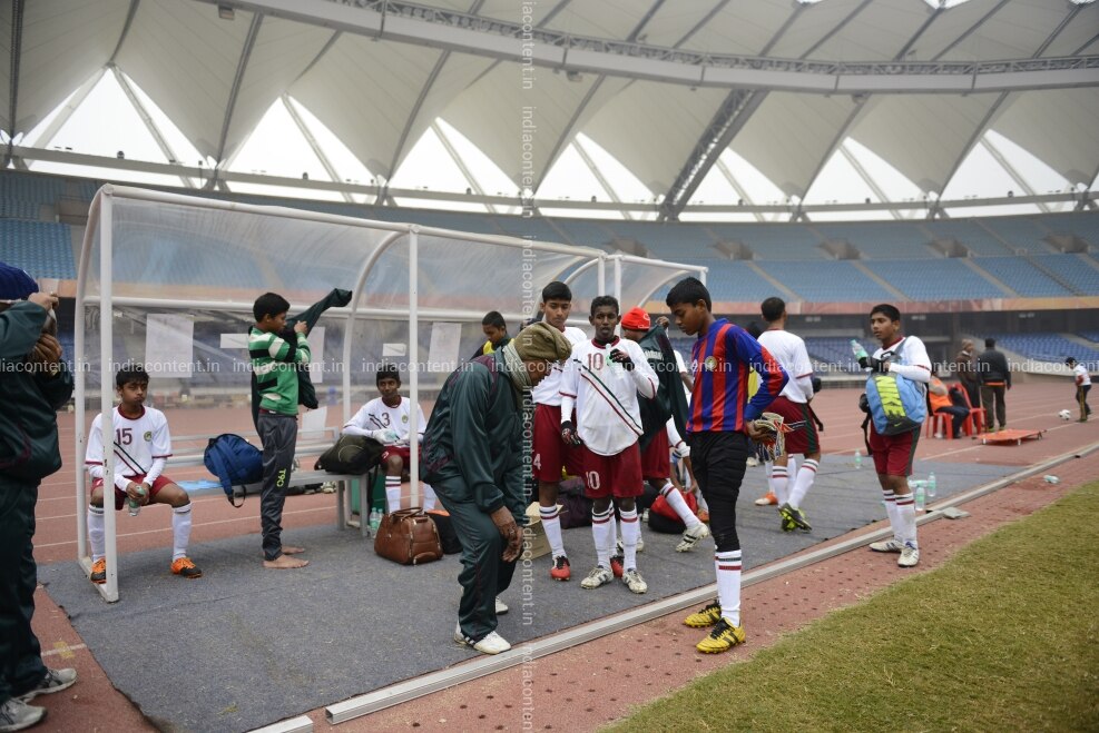 Players getting instruction for a Football match at Jawahar Lal stadium New Delhi. Dated 17th January 2014. Photo by Rajwant Rawat.
