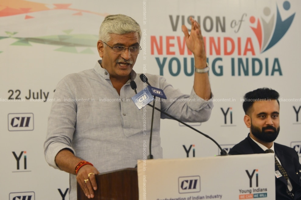 NEW DELHI INDIA JULY 22 Minister of Jal Shakti Gajendra Singh Shekhawat clicked while addressing public during the Interaction on Vision of New Young India in New Delhi. Photo by K Asif India Today Group Gajendra Singh Shekhawat
