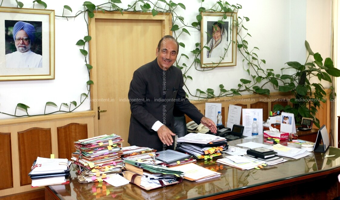 NEW DELHI INDIA - APRIL 26 Union Minister for Health and Family Welfare Ghulam Nabi Azad at his office before a meeting with United Nations Secretary General Ban Ki-moon in New Delhi on April 26 2012. Photo by Shekhar Yadav India Today Group Ghulam Nabi Azad