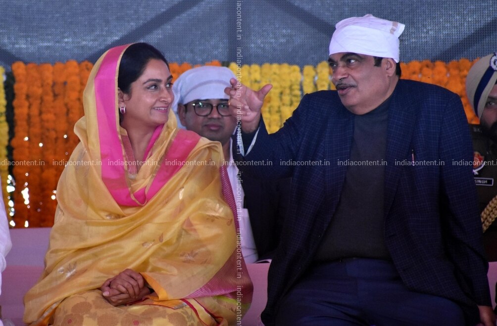 Gurdaspur Union Road Transport and Highways Minister Nitin Gadkari in a conversation with Union Food Processing Industries Minister Harsimrat Badal at the foundation stone laying ceremony of a road that will link the border belt of Punjab's Gurdaspur district with the Kartarpur Sahib gurdwara corridor in Mann village near Dera Baba Nanak in Punjab's Gurdaspur on Nov 26 2018. Photo IANS