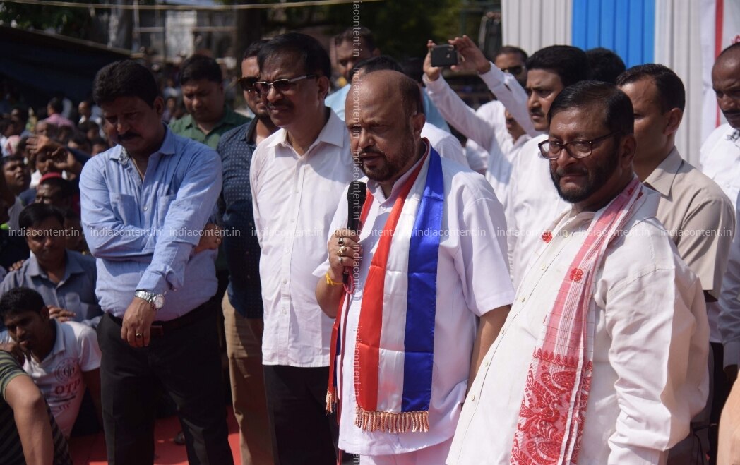 Guwahati Asom Gana Parishad AGP leader Prafulla Kumar Mahanta addresses during a rally organised by the party in protest against the Joint Parliamentary Committee's JPC proposed meeting with the Ministries of Home and External Affairs over the Citizenship Amendment Bill 2016 in Guwahati on Oct 23 2018. Photo IANS