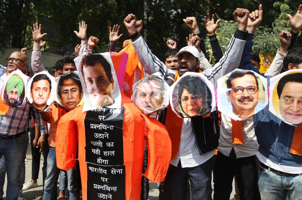 NEW DELHI INDIA MARCH 07 Hindu Sena members protest against politicians who questioned recent air strikes with Pakistan New Delhi. Photo by Qamar Sibtain India Today Group