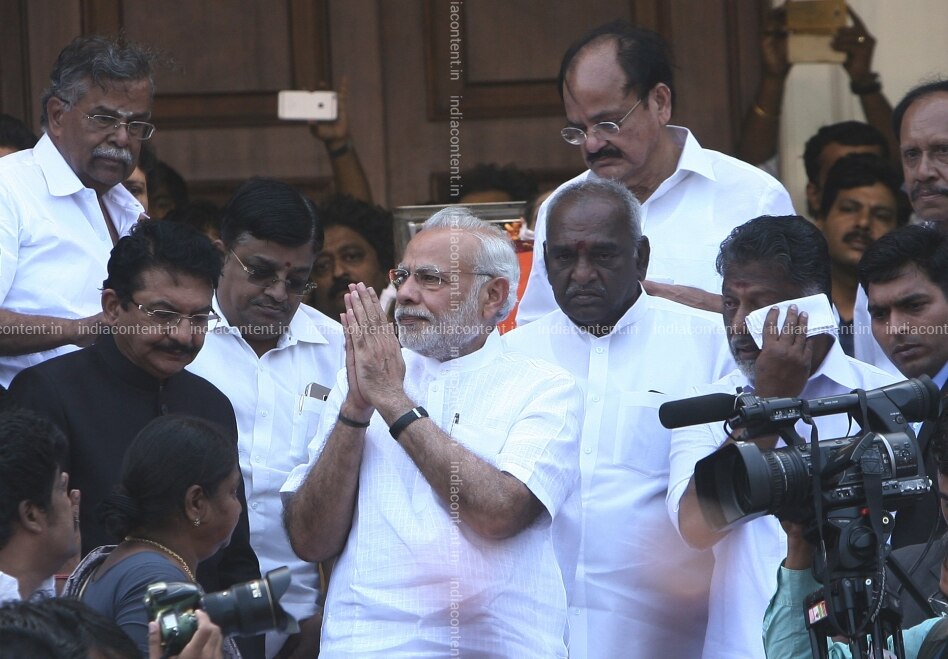 Prime minister of India Narendra Modi greets the crowd after paying his last respect to J Jayalalilthaa who passed away at Rajaji hall in Chennai on Tuesday December 06 2016. Photo by Jaison G
