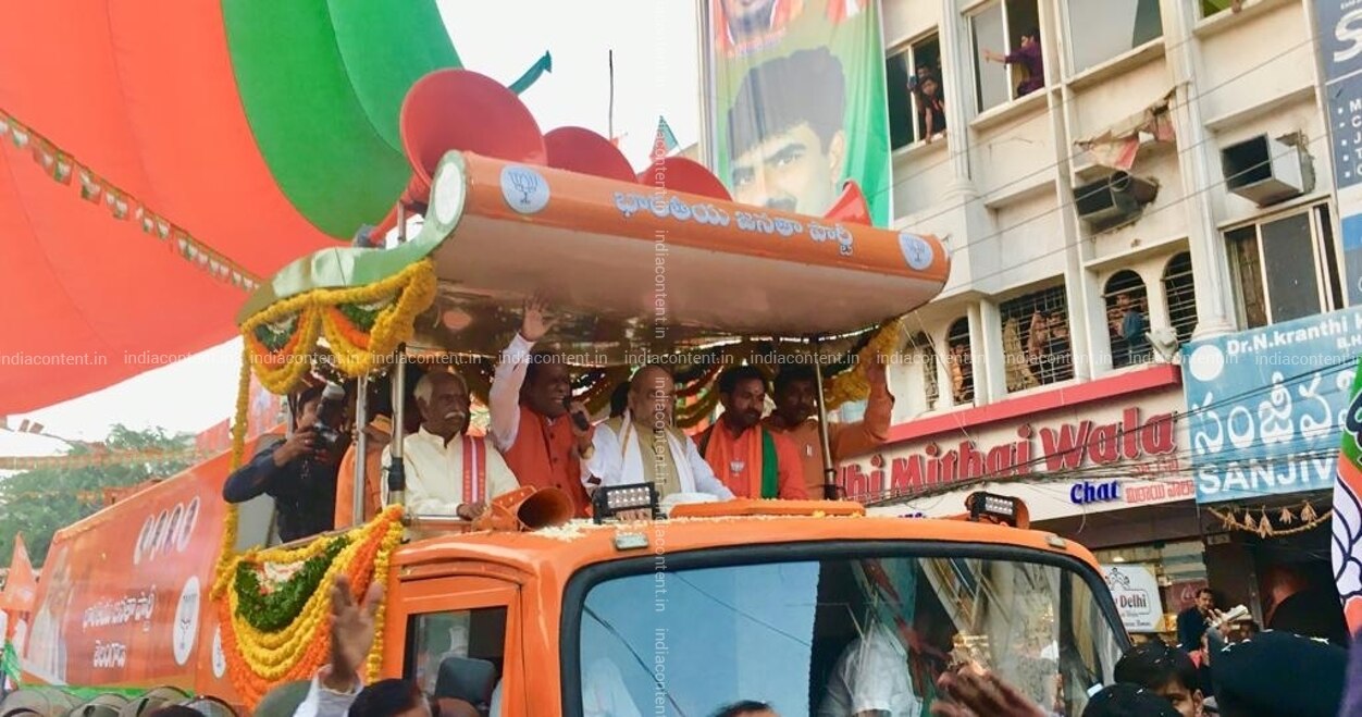 Hyderabad BJP chief Amit Shah during a road show at Musheerabad in Hyderabad on Nov 28 2018. Photo IANS