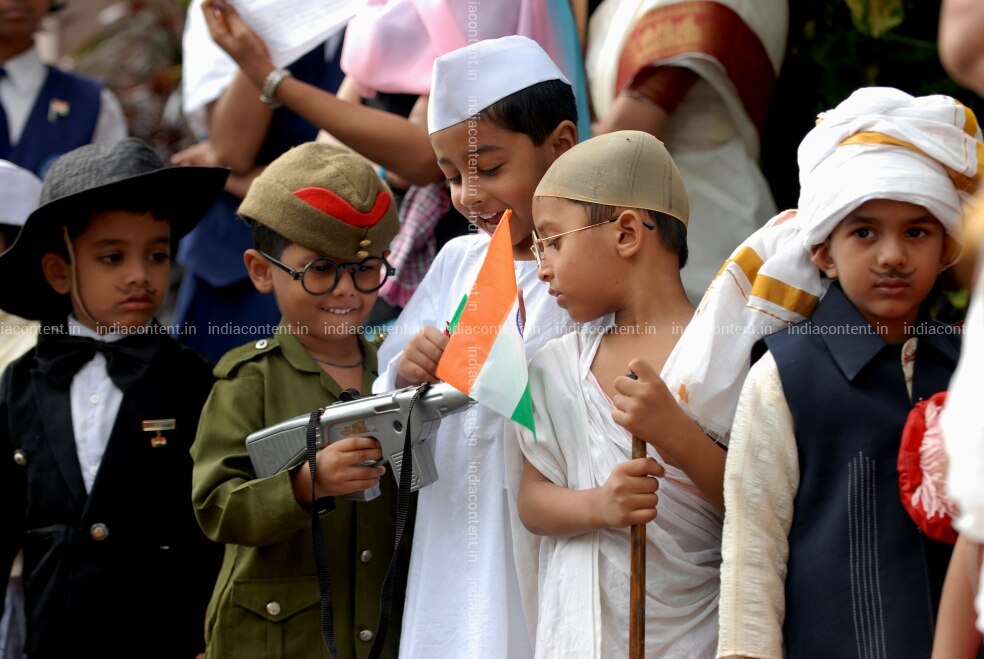Children dressed up as freedom fighter participate in a fancy dress competition during 60th Independence Day Celebration at Holy Angel High School Dombivli in Mumbai Maharashtra India