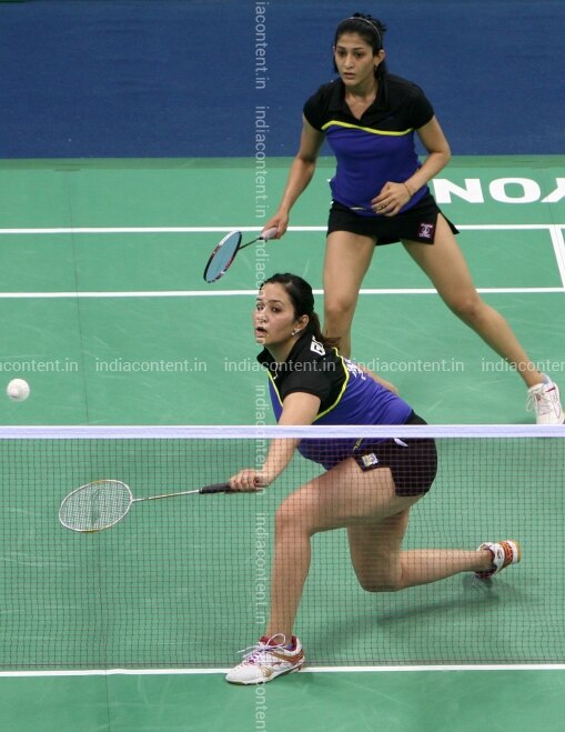 NEW DELHI INDIA - APRIL 28 Jwala Gutta and Ashwini Ponnappa of India play a shot against Malaysias Eei Hui Chin in the womens doubles round badminton match of India Open Super Series 2011 in New Delhi on Thursday. Photo by K Asif India Today Group Jwala GuttaAshwini Ponnappa
