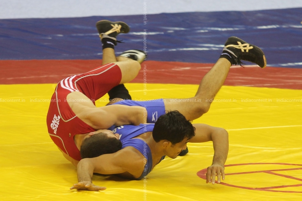 NEW DELHI INDIA OCTOBER 5 Terence Bosson of England red challenges Ravinder Singh of India during their 60 kg mens Greco-Roman wrestling match at the Commonwealth Games in New Delhi October 5 2010. Ravinder Won the Gold. Photo by Shekhar Yadav India Today Group Terence BossonRavinder Singh