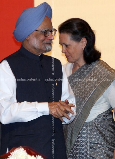 NEW DELHI INDIA OCTOBER 31 Prime Minister Manmohan Singh and UPA Chairperson Sonia Gandhi interact during the Indira Gandhi Award for National Integration presentation function in New Delhi on October 31 2010. Photo by Shekhar Yadav India Today Group Manmohan SinghSonia Gandhi