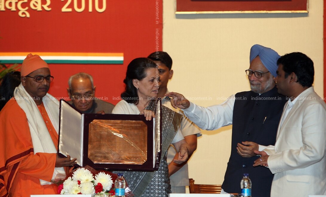 NEW DELHI INDIA OCTOBER 31 Prime Minister Manmohan Singh and UPA Chairperson Sonia Gandhi present the Indira Gandhi Award for National Integration to joint winners Ramakrishna Mission Ashram and musician A R Rahman during the Indira Gandhi Award for National Integration presentation function in New Delhi on October 31 2010. Photo by Shekhar Yadav India Today Group Manmohan SinghSonia GandhiAR Rahman