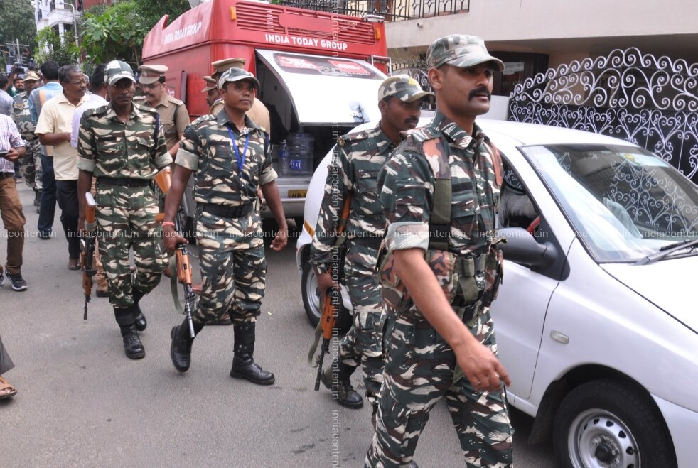 CHENNAI, TAMIL NADU-DECEMBER 21: CRPF personnel clicked outside the residence of Chief Secretary of Tamil Nadu, P. Rama Mohana Rao during the raid by IT officials in Chennai. Photo by Jaison G India Today Group