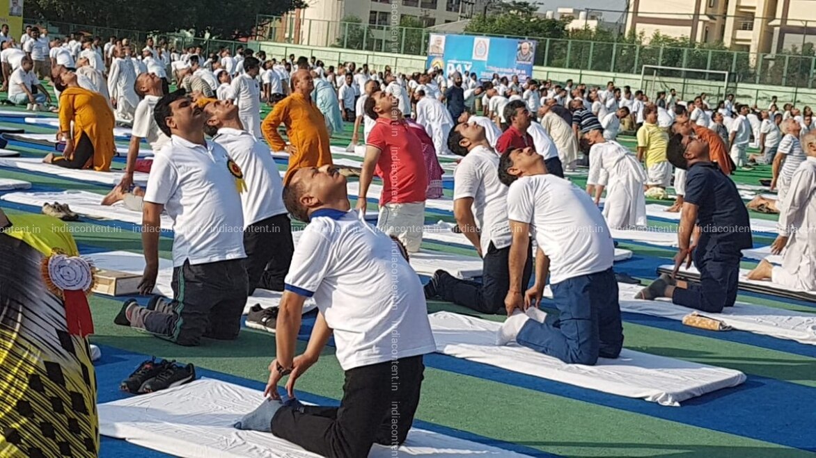 Jammu Union Minister Jitendra Singh practices yoga 'asanas' postures during Fourth International Yoga Day celebrations in Jammu on June 21 2018. Photo IANS PIB