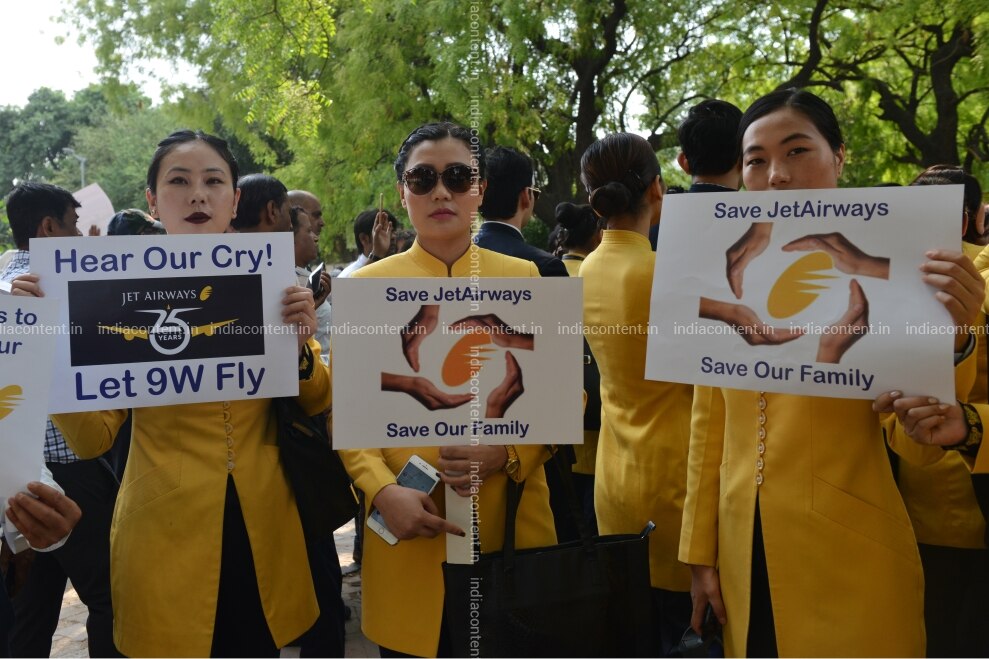 NEW DELHI INDIA APRIL 18 Jet Airways employees clicked as they gather to make an appeal to save the airline after it announced temporary suspension of flight operations in New Delhi. Photo by K Asif India Today Group