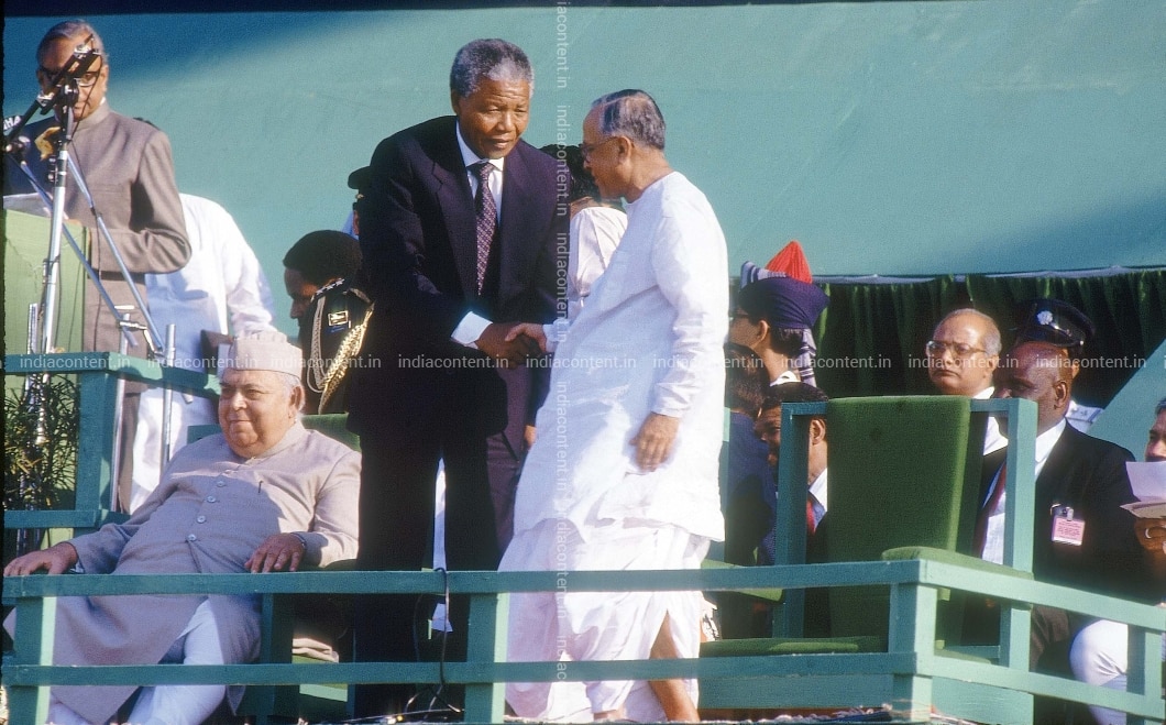 Jyoti Basu Chief Minister shaking hands with Nelson Mandela of South Africa at Kolkata West Bengal Foreign Affairs News Profile