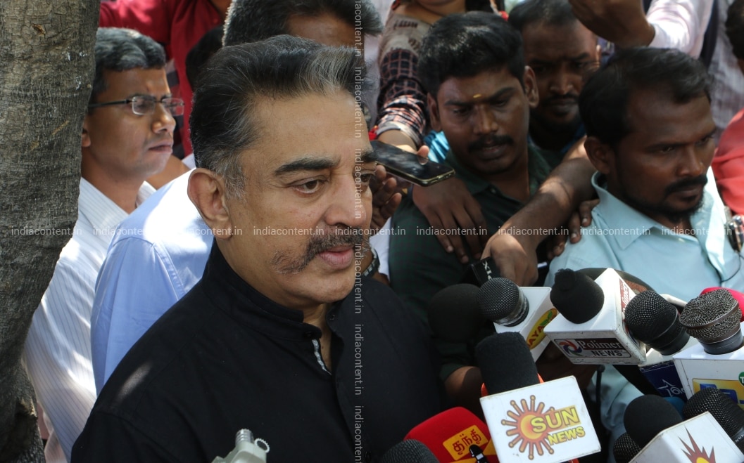 Makkal Neethi Meyyam MNM leader Kamal Hasan speaking to the media after lodging a complaint with the DIG of police on the infamous Pollachi sex scandal case the office of the top cop in Chennai on Tuesday March 12 2019. Photo by Jaison G