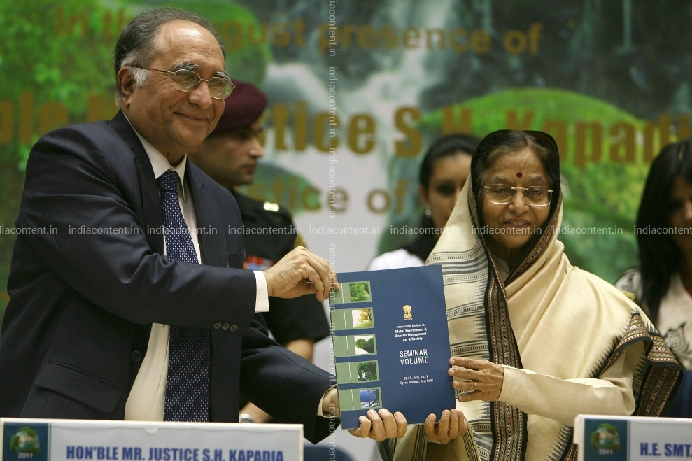 NEW DELHI INDIA - JULY 22 President Pratibha Devisingh Patil receives a souvenir from Chief Justice of India Justice S H Kapadia during the inaugration of the Global Environment and Disaster Management Law and Society Justice programme in New Delhi on Friday July 22 2011. Photo by Shekhar YadavIndia Today Group SH KapadiaPratibha Patil