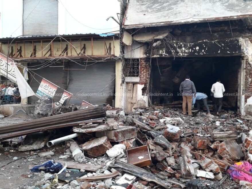 Khammam A view of the cloth store which was gutted while others were damaged in a fire accident at Kaman Bazar in Khammam of Telangana on Oct 29 2018. Photo IANS