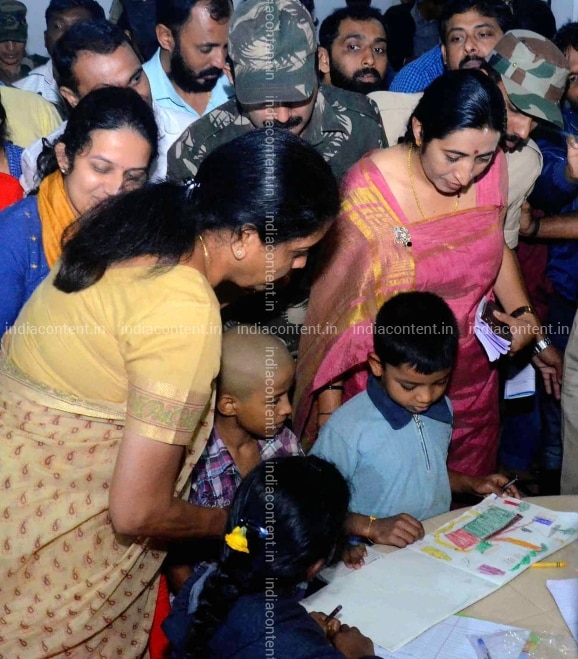 Kodagu Union Defence Minister Nirmala Sitharaman during her visit to rehabilitation center in Kodagu district of Karnataka on Aug 24 2018. Photo IANS