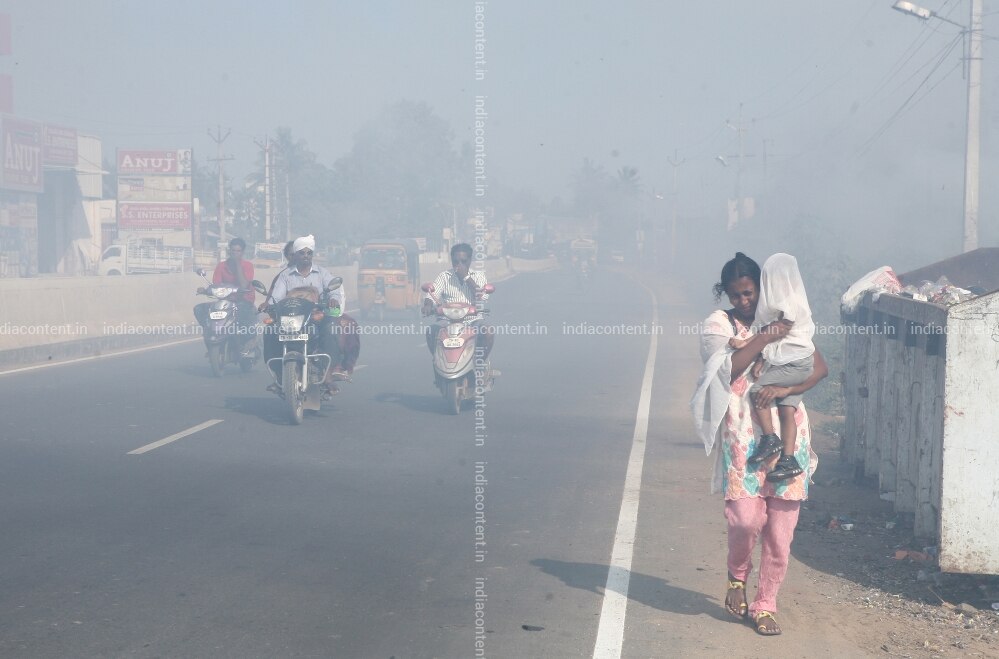 Smoke from burning wastes blocks the view of commuters at CTH road at Avadi near Chennai on February 23 2015. Photo by Jaison G Air Pollution. Woman Child