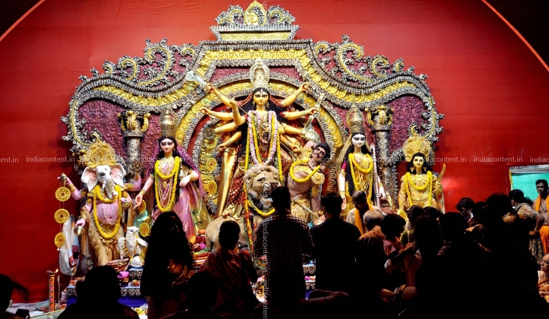 Buy Kolkata A view of an idol of Goddess Durga flanked by the idols of Hindu Gods Ganesh Lakshmi Saraswati and Kartikeya at BJ Block community Durga Puja pandal during Durga Navami celebrations at Salt Lake in Kolkata on Oct 7 2019 Photo Kuntal C Pictures, Images, Photos By IANS - Others pictures