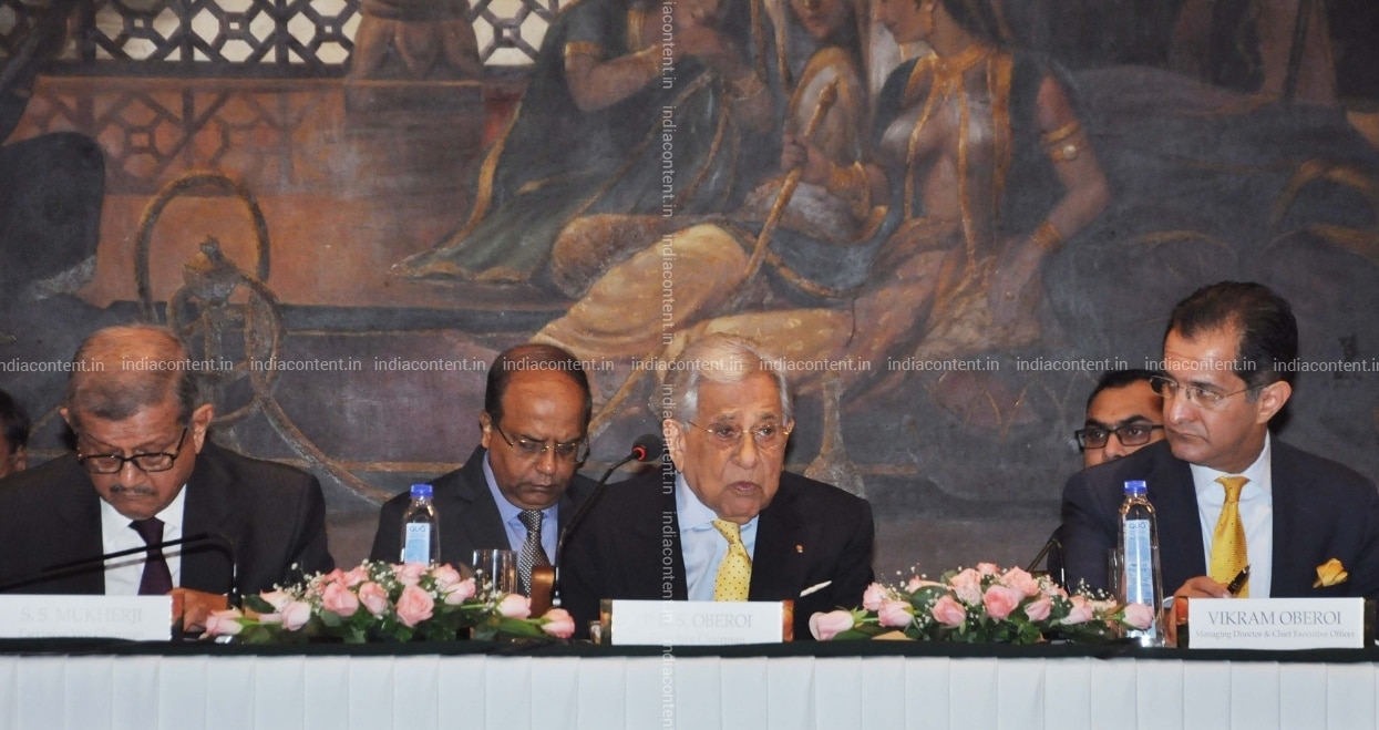 Kolkata EIH Limited Executive Chairman Prithvi Raj Singh Oberoi MD and CEO Vikram Oberoi and Executive Vice Chairman S.S. Mukherji during the Annual General Meeting of EIH Limited in Kolkata on Aug 1 2018. Photo Kuntal Chakrabarty IANS