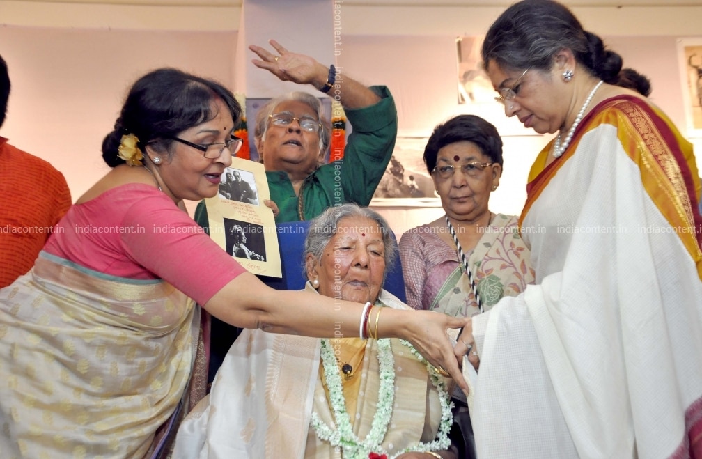 Kolkata Indian danseuse Amala Shankar along with her family members celebrate her 100th birthday in Kolkata on June 27 2018. Also seen Amala Shankar's daughters Mamata Shankar and Tanusree Shankar. Photo Kuntal Chakrabarty IANS