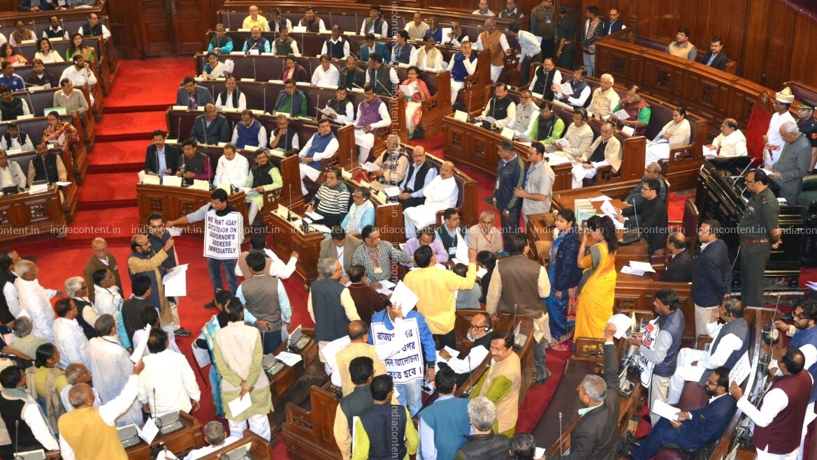 Kolkata Opposition party legislators stage a demonstration demanding a discussion on West Bengal Governor Keshari Nath Tripathi's inaugural address during the Budget session of the state assembly in Kolkata on Feb 1 2019. Photo IANS