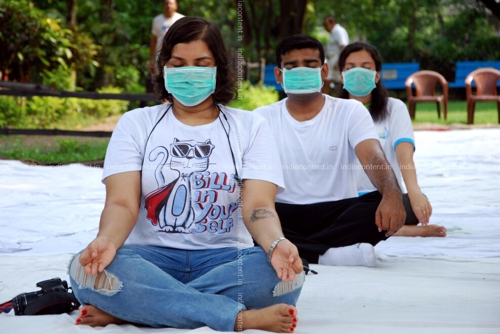 Kolkata People practice yoga 'asanas ' postures wearing masks on the Fourth International Yoga Day in Kolkata on June 21 2018. Photo Kuntal Chakrabarty IANS