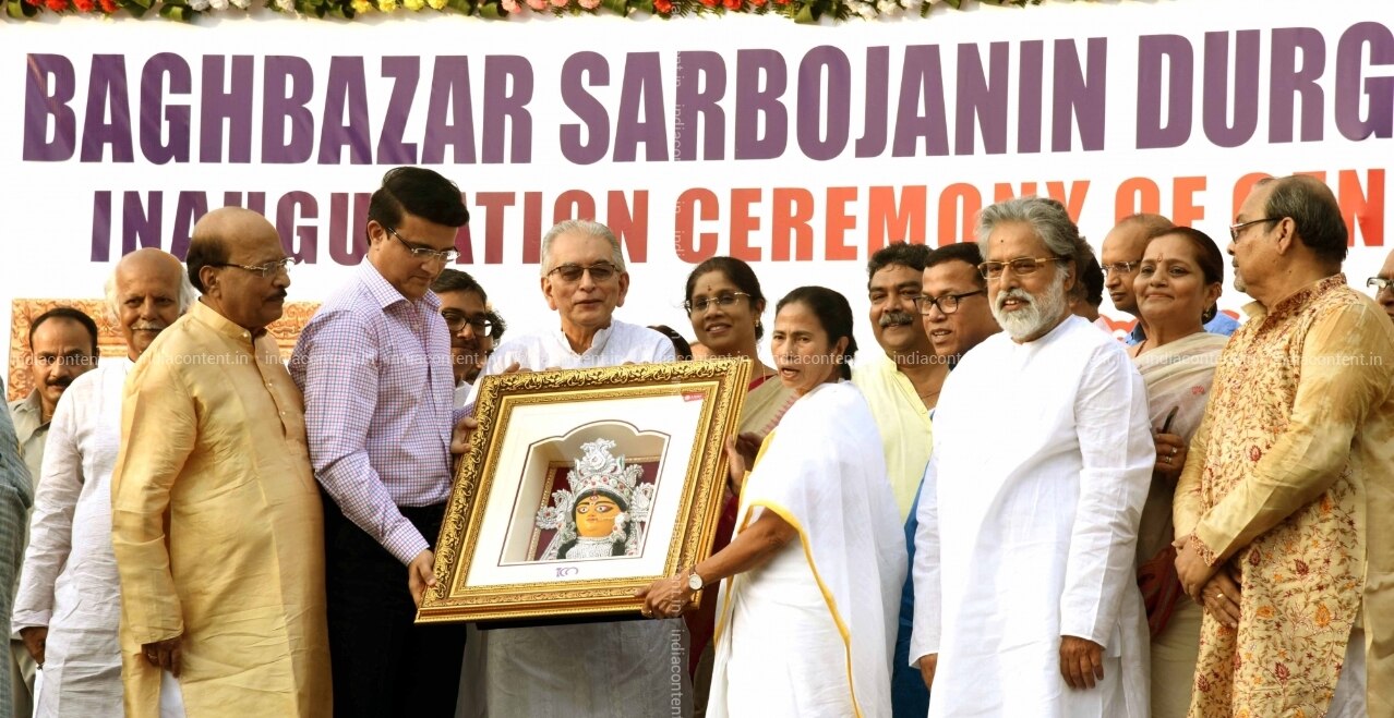 Buy Kolkata West Bengal Chief Minister Mamata Banerjee and former Indian cricketer and Cricket Association of Bengal CAB President Sourav Ganguly at the inauguration of Bagbazar Sarbojanin Durga Puja pandal in Kolkata on Oct 8 2018 Photo IANS Pictures, Images, Photos By IANS - Others pictures