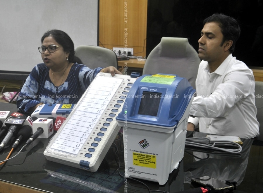 Kolkata West Bengal's Joint Chief Electoral Officer Anamika Majumder and Deputy Chief Electoral Officer Sumanta Roy demonstrate the usage of Electronic Voting Machine EVM and Voter verifiable paper audit trail VVPAT during a voter awareness programme organised ahead of 2019 Lok Sabha elections at Election Commission office in Kolkata on April 5 2019. Photo IANS