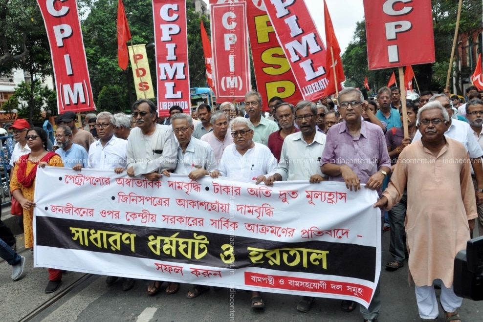 Kolkata Workers of Left parties lead by Left Front Chairman Biman Bose CPI M State Secretary Surjya Kanta Mishra and others participate in a protest march organised during a day long 'Bharat Bandh' or nationwide shutdown called by the Congress and Left parties to protest rising fuel prices in Kolkata on Sept 10 2018. Photo IANS