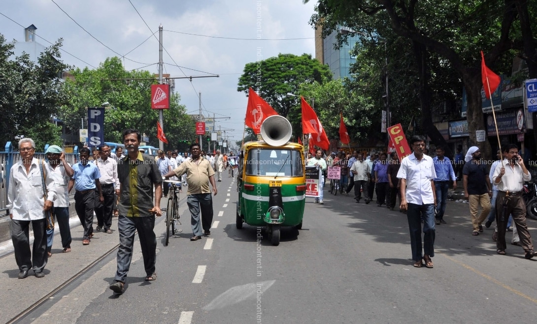 Buy Kolkata Workers of Left parties lead by Left Front Chairman Biman Bose CPI M State Secretary Surjya Kanta Mishra and others participate in a protest march organised during a day long Bharat Bandh or nationwide shutdown called by the Congress and Pictures, Images, Photos By IANS - News pictures