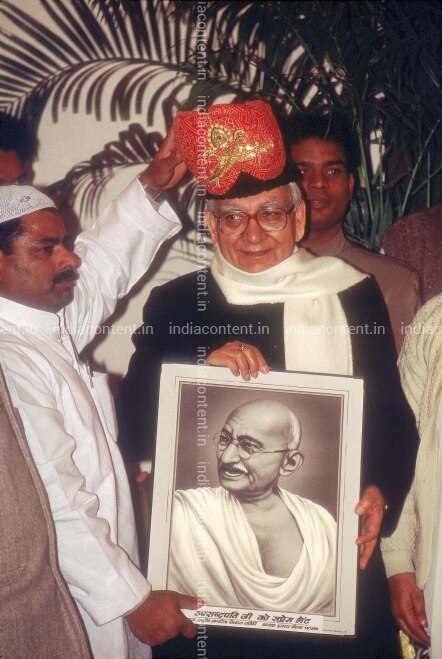 NEW DELHI INDIA DECEMBER 14 Vice President Krishna Kant clicked holding Mahatma Gandhi's Portrait at a Iftar party in New Delhi. Photo by Dilip Banerjee India Today Group Krishna Kant