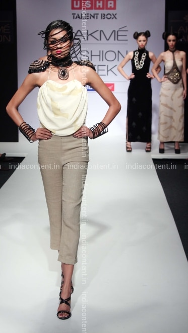 MUMBAI INDIA - AUGUST 07 A models walks the ramp showcasing the creation of designer Sourabh Kant Shrivastava during Day 5 of Lakme Fashion Week LFW WinterFestive 2012 at Grand Hyatt in Mumbai. Photo by Yogen Shah India Today Group
