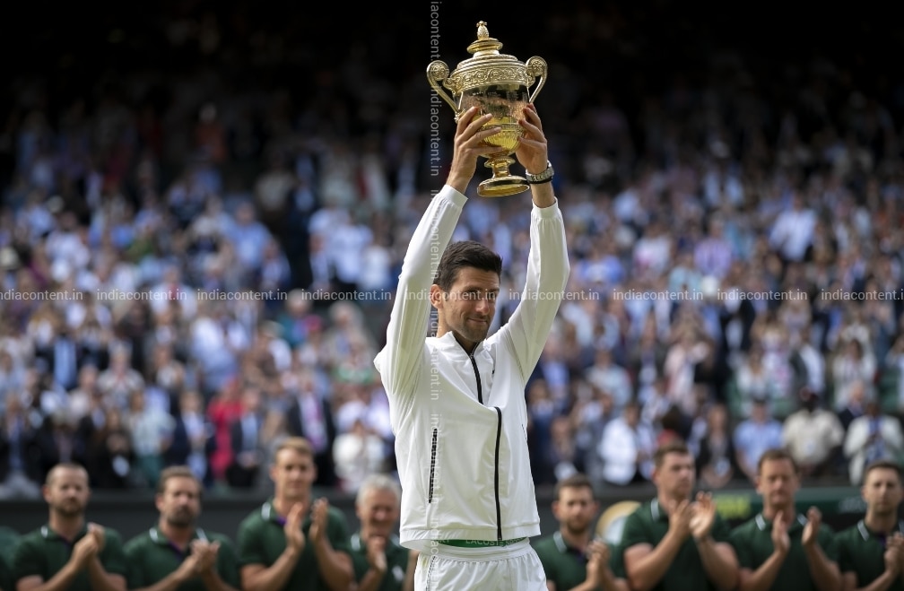 Buy LONDON July 15 2019 Xinhua Novak Djokovic of Serbia holds the trophy after winning the mens singles final against Roger Federer of Switzerland at the 2019 Wimbledon Tennis Championships in London Britain on July 14 2019 Novak Djokovic won Pictures, Images, Photos By IANS - Others pictures