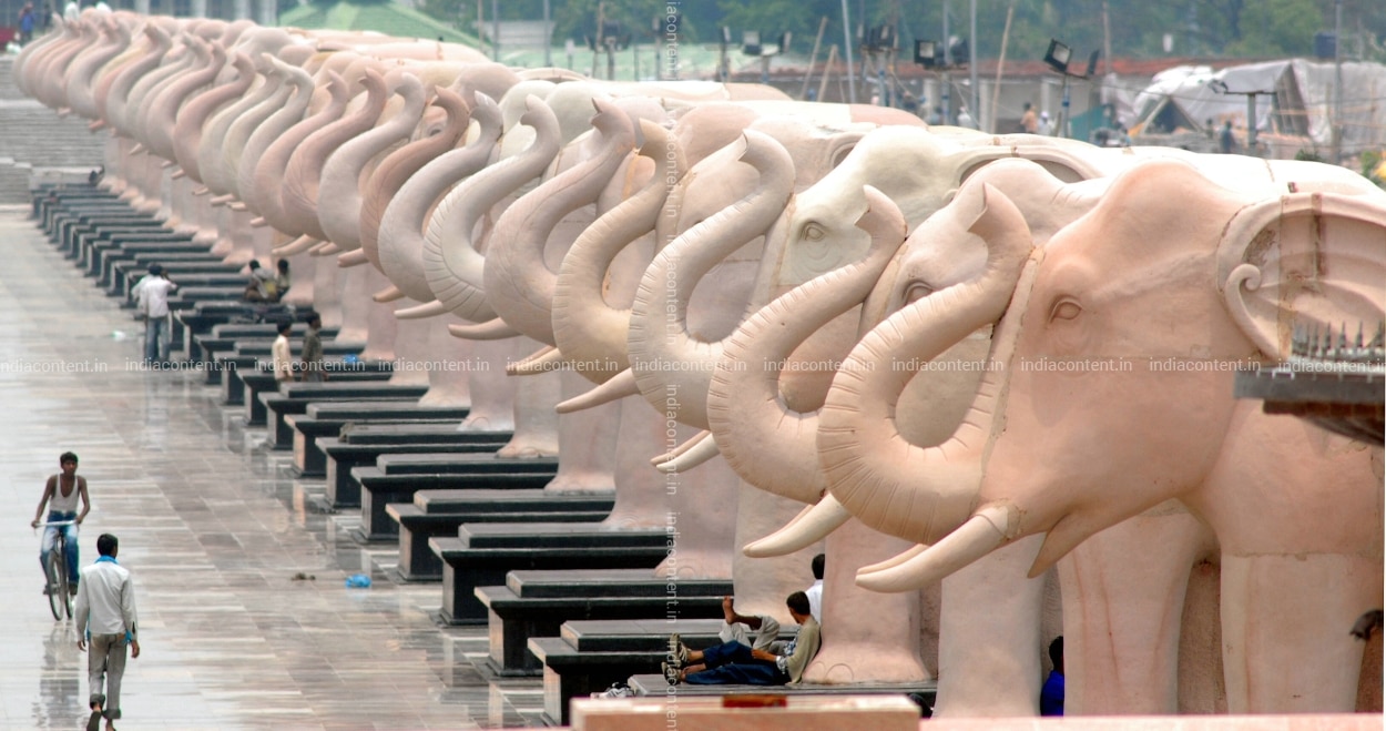 Aerial View of Ambedkar Park in Lucknow Uttar Pradesh India. Mayawati is addressing people's sentiments and emotions by building monuments and memorials to commemorate BR Ambedkar and Kanshi Ram Elephants by Mayawati Bahujan Samaj Party President and Chief Minister of Uttar Pradesh