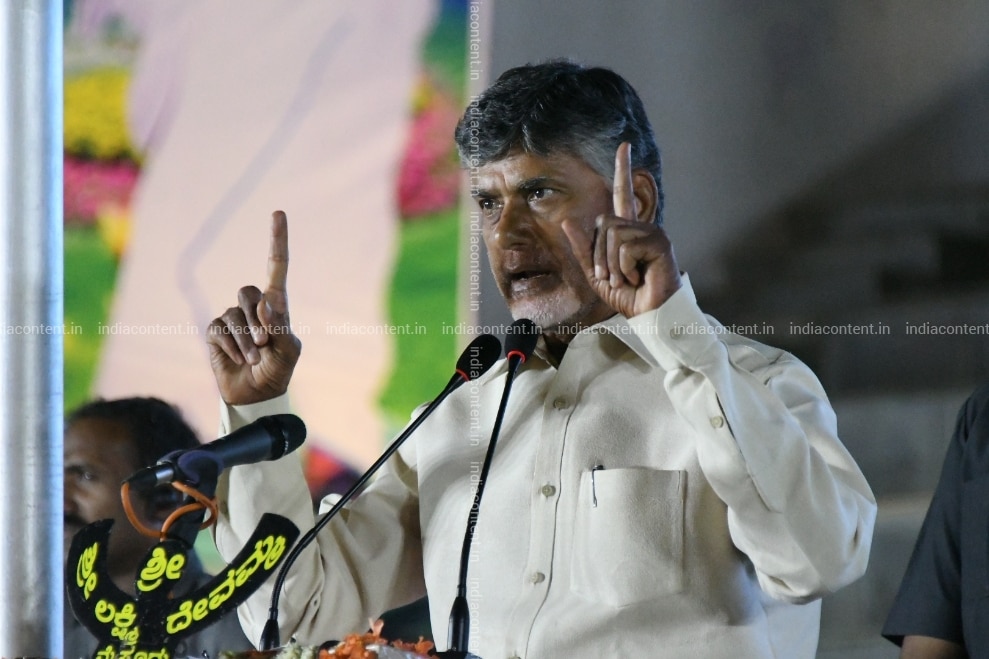 Mandya Andhra Pradesh Chief Minister N. Chandrababu Naidu addresses during a programme in Mandya on April 15 2019. Photo IANS