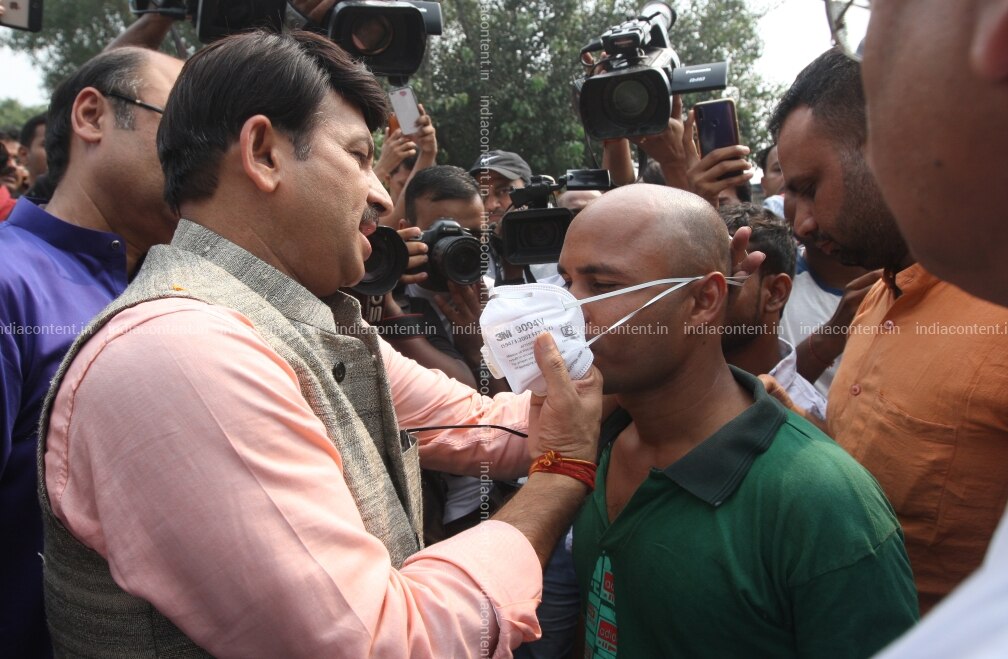 NEW DELHI INDIA OCTOBER 13 Member of the Lok Sabha Manoj Tiwari distributes pollution masks in New Delhi. Photo by Qamar Sibtain India Today Group Manoj Tiwari