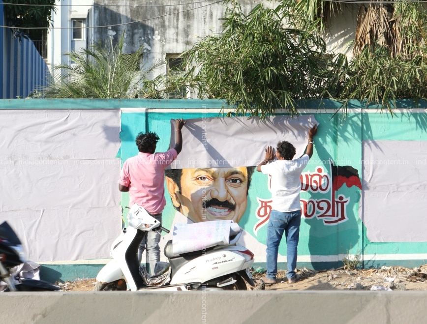 DMK party workers masking wall paintings of their leader MK Staling in view of election code of counduct. A scene from Chennai on Monday March 25 2019. Photo by Jaiosn G