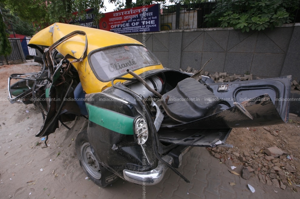 NEW DELHI INDIA JUNE 3 The mangled remains of the Ambassador outside the office of the Assistant Commissioner of Police in New Delhi on June 3 2010. A 28-year-old woman was killed when the taxi she was travelling in had a head-on collision with a speeding Mercedes car belonging to a BSP leaders son in South Delhi. Photo by Jyoti Kapoor India Today Group