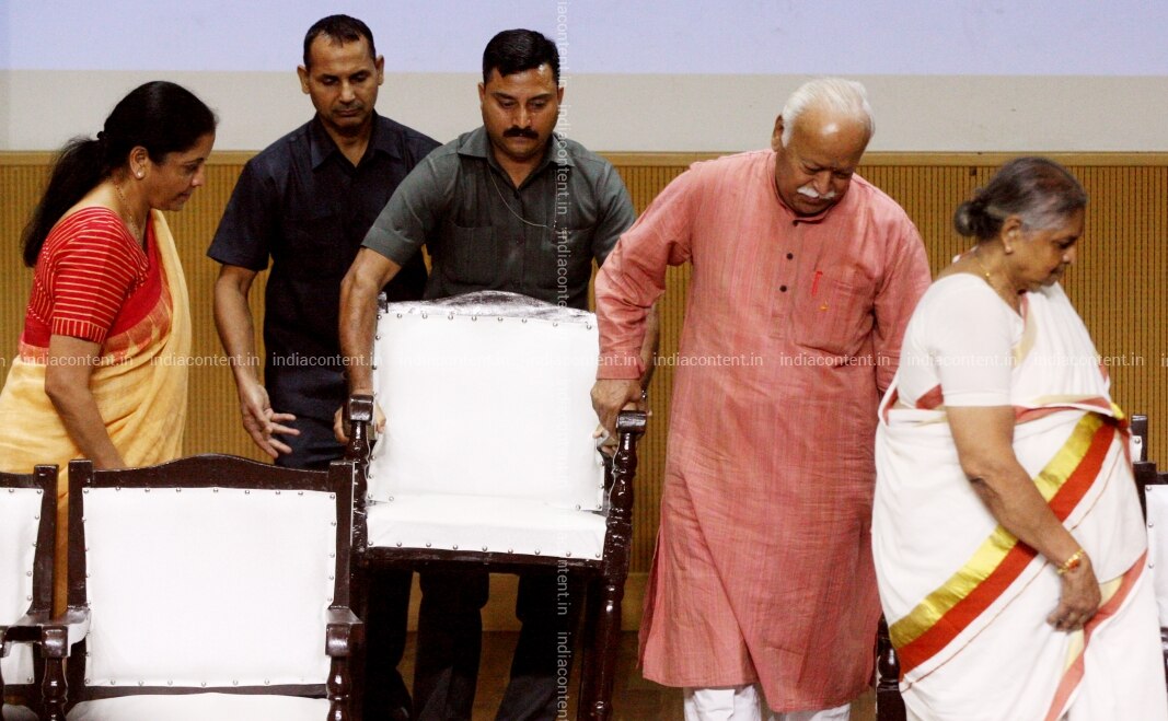 NEW DELHI INDIA SEPTEMBER 24 Member of Rajya Sabha Nirmala Sitharaman and Sarsanghchalak of the Hindu nationalist organisation Rashtriya Swayamsevak Sangh Mohan Bhagwat clicked during launch of book Status of Women in India . Photo by Qamar Sibtain India Today Group Mohan Bhagwat Nirmala Sitharaman