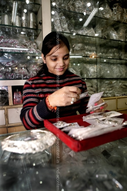 A young girl looking at a jewellery piece at Multan Enamel Mart Jewellers in Dariba Kalan at Chandni Chowk New Delhi Shops Jewellery Business Economy