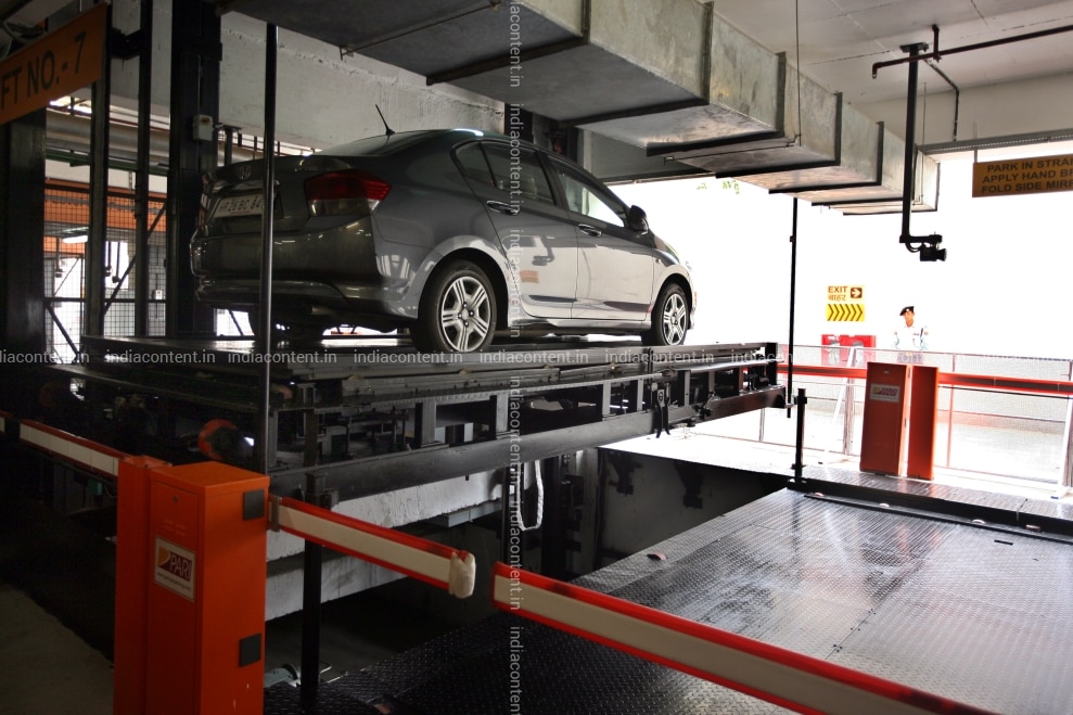 NEW DELHI INDIA - JUNE 12 A car being lifted to a parking slot at the launch of an automated multi-level car park Capitol Point at Connaught Place in New Delhi on Tuesday. Photo by Parveen Negi India Today Group