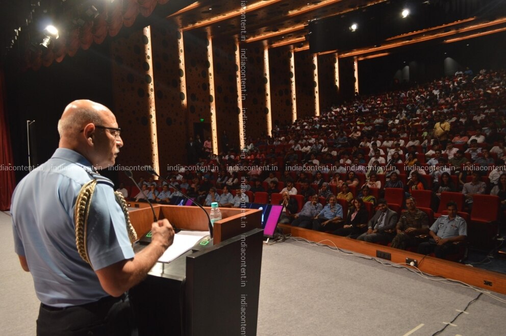 Mumbai Air Officer Commanding in Chief AOC in C of the South Western Air Command Air Marshal RK Dhir addresses the students of Narsee Monjee Institute of Management Studies NMIMS in Mumbai on Aug 13 2018. Photo IANS