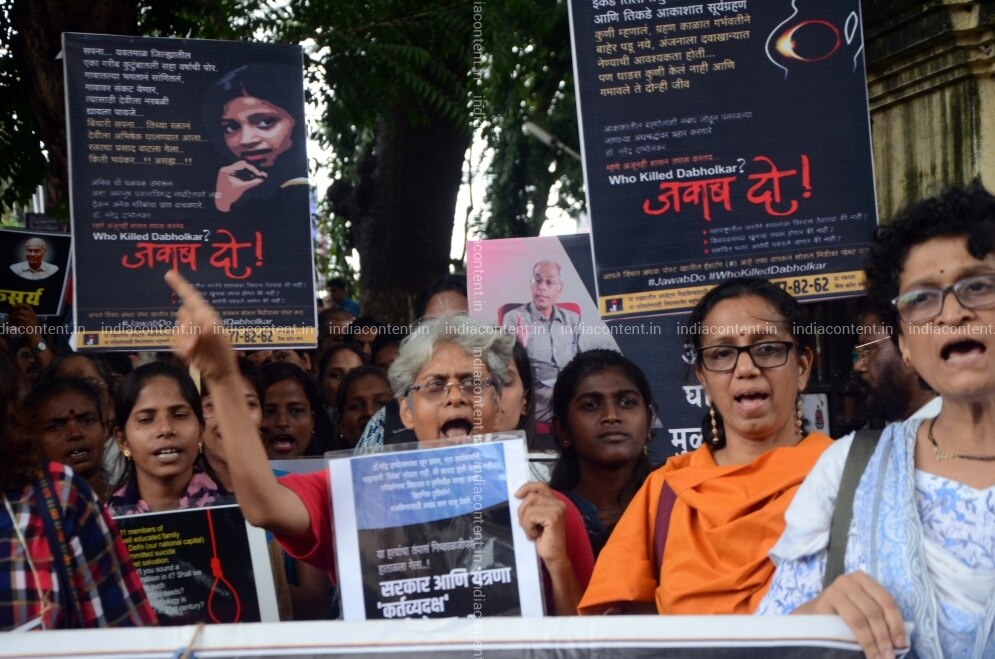 Mumbai Andhashraddha Nirmoolan Samiti ANIS activists stage a demonstration over Maharashtra rationalist and ANIS founder Narendra Dabholkar's murder in Mumbai on Aug 20 2018. Photo IANS