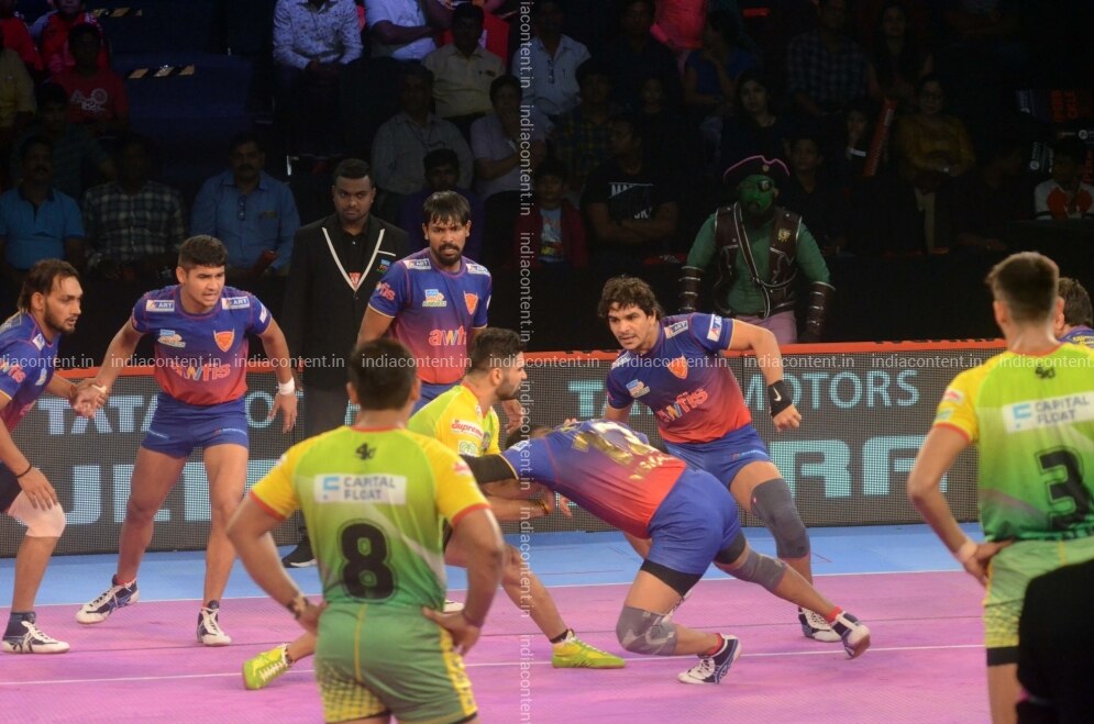 Mumbai Players in action during a Pro Kabaddi League 2018 match between Patna Pirates and Dabang Delhi at NSCI in Mumbai on Nov 15 2018. Photo IANS
