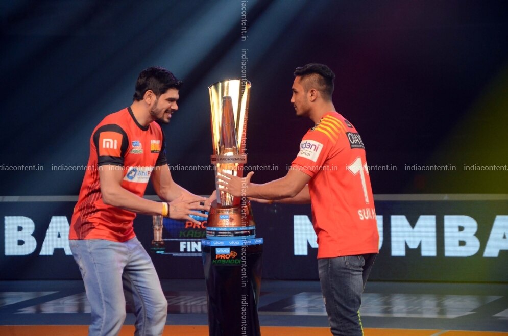 Mumbai Rohit Kumar and Sukesh Hegde captains of Bengaluru Bulls and Gujarat Fortune Giants respectively during a programme in Mumbai on Jan 4 2019. Photo IANS