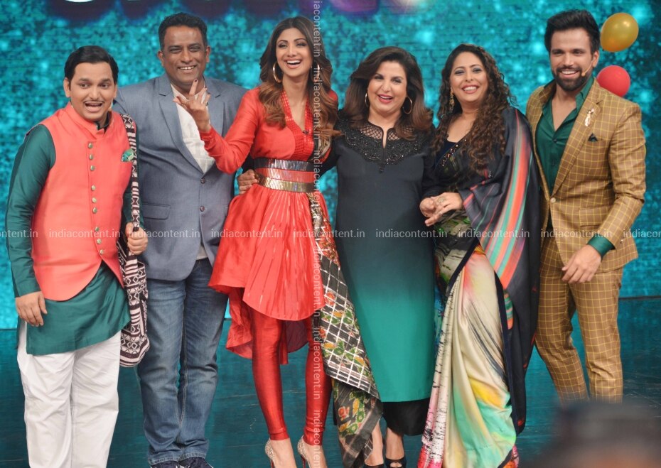 MUMBAI INDIA JANUARY 08 Farah Khan along WITH Shilpa Shetty Geeta Kapoor Anurag Basu Rithvik Dhanjani AND Paritosh Tripathi during the shoot of SUPER Dancer - Chapter 2 IN Mumbai.Photo BY Milind Shelte India Today GROUP Farah KhanShilpa ShettyGeeta KapoorAnurag BasuRithvik DhanjaniParitosh Tripathi